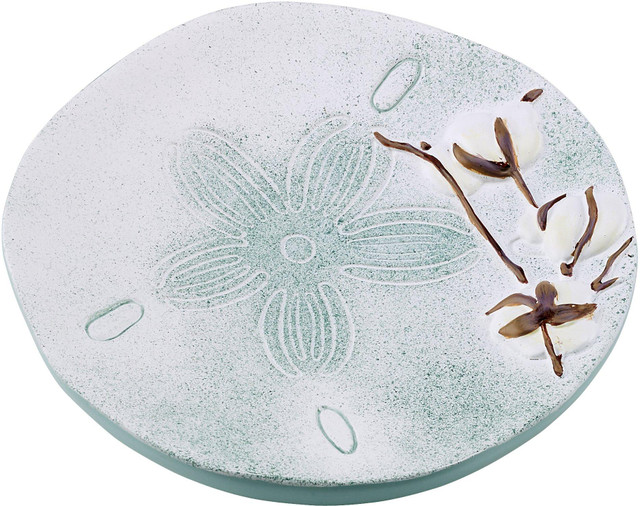 The Avanti Farmhouse Shell Soap Dish is a light blue dimensional sand dollar decorated with cotton on the vine. Made in incredible detail in durable resin and hand painted. Measures: 5.12 x 5.12 x .87.