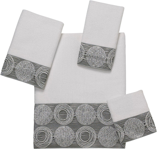 Avanti Galaxy Towel Collection features a metallic border design with irregular circles in shades of silver and grey on 100% cotton white towel. Bath: 27'' x 50'', Hand: 16'' x 30'', Washcloth: 13'' x 13'' and Fingertip: 11'' x 18''. Each towel sold separately.