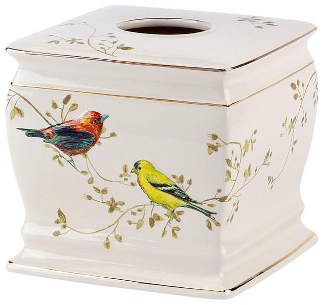 The Gilded Birds collection by Avanti, features birds and leaves accented with gold rims along the top and bottom. Tissue Box is ceramic and measures 6.1875'' x 3.1875'' x 6''.