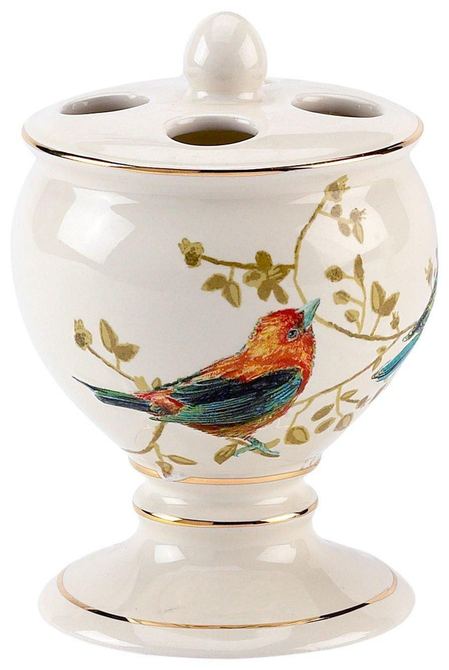 The Gilded Birds collection by Avanti, features birds and leaves accented with gold rims along the top and bottom. Toothbrush holder features 4 holes for brushes and measures 3.1875'' x 5''.