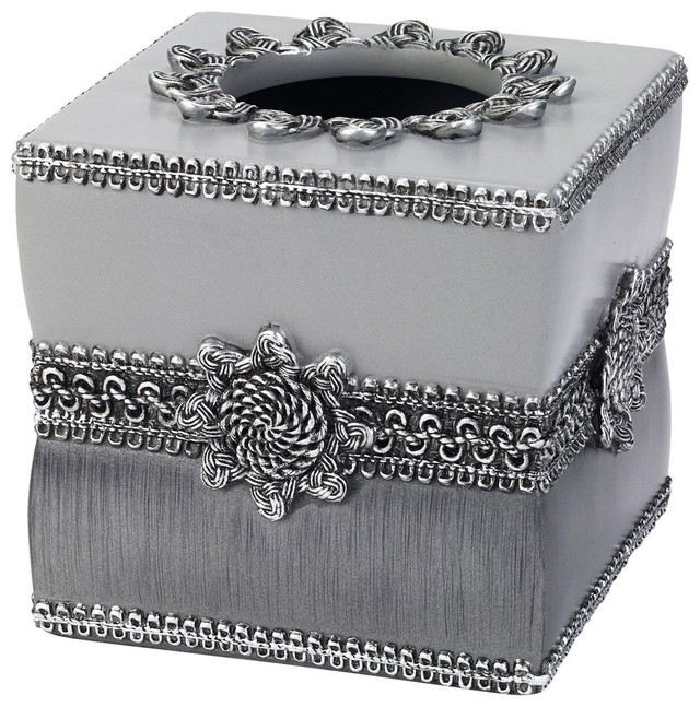 Avanti Granite Braided Medallion Tissue Box Holder features 2-tone body that is separated by intricately carved beads and a medallion. Measures: 6.18'' x 6.18'' x 5.9''.