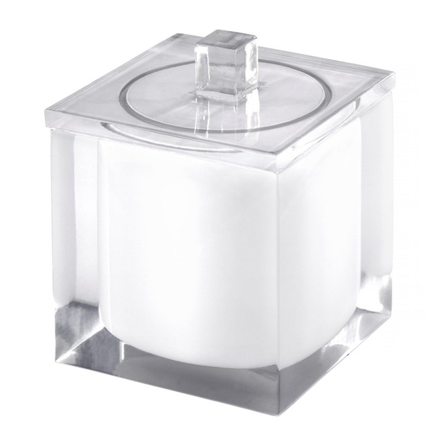 The Izod Marina White Covered Jar features a clear resin exterior that shows off the white interior for a sleek, modern look. The clear top has a pull for easy use. The perfect addition to any bathroom, bedroom or office. Made of durable resin for years of use.