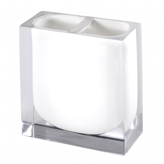 The Izod Marina White Toothbrush Holder features a clear resin exterior that highlights the painted white interior to combine for a sleek, modern look. The top opening is divided in half-ideal for holding your toothbrushes, make-up brushes or pens/pencils. Made of durable resin.