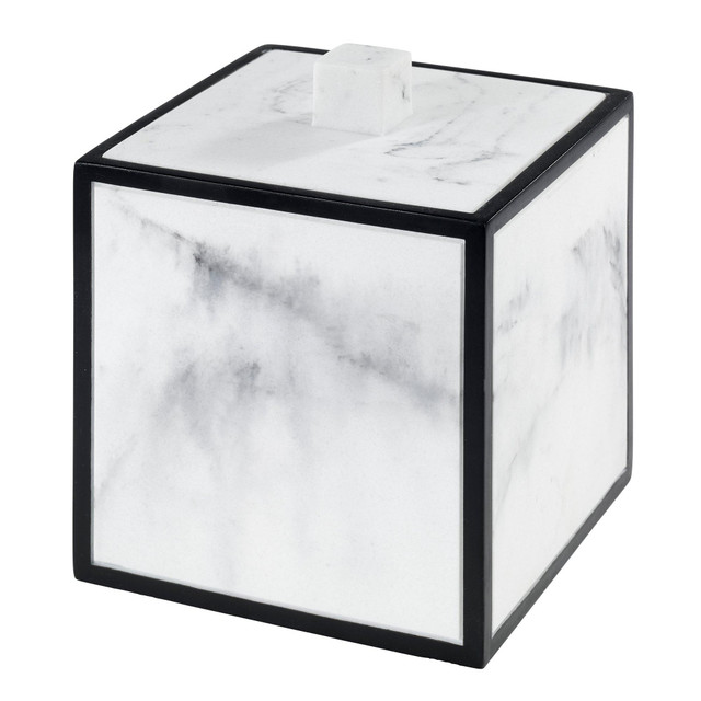 The Avanti Jasper Covered Jar delivers a clean, updated look with a square, marble-look body framed with a thin black line on all sides and the cover. Made of durable resin for easy care and long life. Perfect for any bathroom, kitchen, office or any room in the house. Imported. Measures 4.50 in x 3.93 in x 3.93 in.