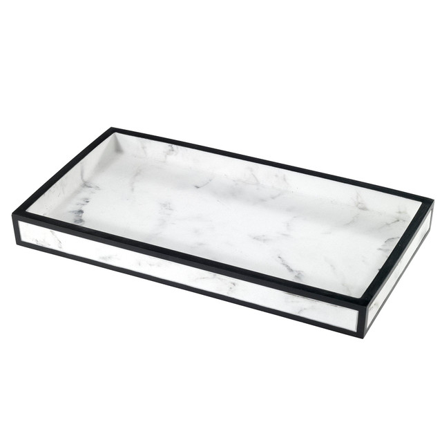 The Avanti Jasper Tray delivers a clean, updated look with a rectangular, marble-look body framed with a thin black line on all sides. Made of durable resin for easy care and long life, 10 x 5.4 . Perfect for any bathroom, kitchen, office or any room in the house. Imported. Measures 10.24 in x 5.51 in x .98 in.