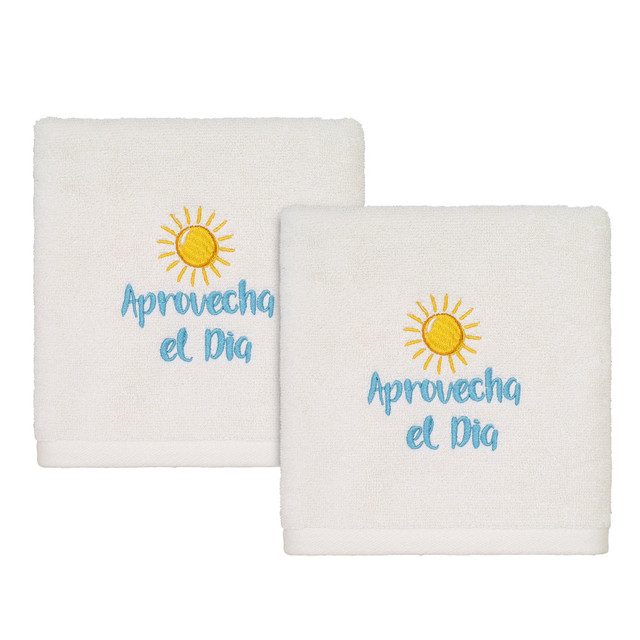 The Avanti Aprovecha el Dia (Seize the Day) 2-pack of decorative hand towels features the saying embroidered in aqua in a playful script with a yellow sun above. The ivory 100% cotton towels measure 16 x 26. Woven out of 2-ply ringspun cotton for superior softness and absorbency. Dimension - L = 28 x W = 16 x H= 0.01