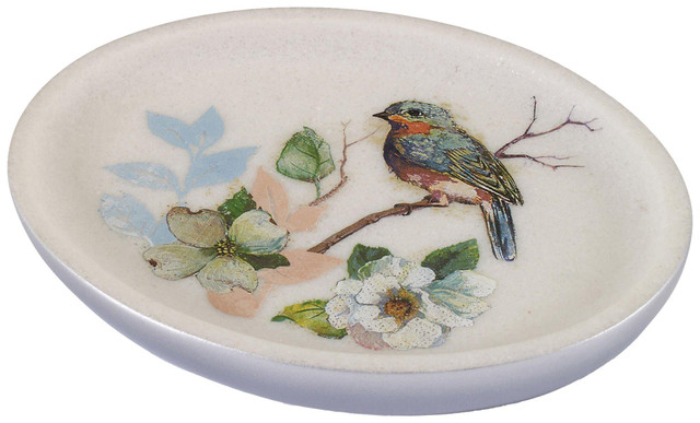 Avanti Love Nest Soap Dish features beautifully rendered birds sitting on branches on a decal applied to an ivory resin base finished with a painted metallic border. Measures: 5.51'' x 4.09'' x .79''.