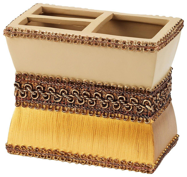 Avanti Braided Medallion Toothbrush Holder features a 2-tone body that is separated by intricately carved braid. Measures: 5.12'' x 3'' x 4.33''.