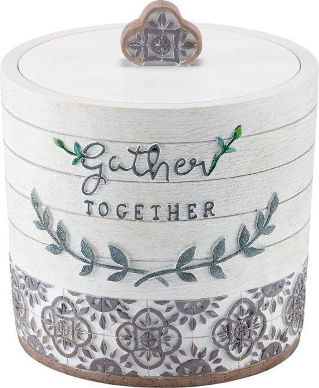 The Avanti Modern Farmhouse Covered Jar is adorned with ''Gather Together'' with a shiplap background and a floor tile border to bring one of today's most popular decorating motifs to your home. Crafted in great detail in hand-painted resin. Measures: 4.13'' x 4.13'' x 4.53''.