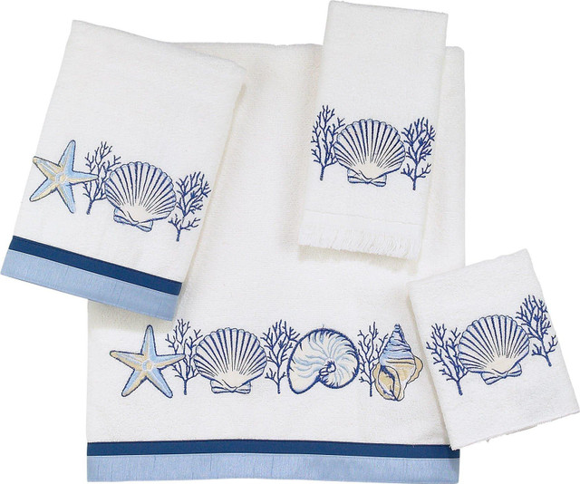 Avanti Nassau Towel Collection will add coastal charm to your bathroom. Towels feature assorted seashells and coral in shades of blue on white towel. Bath: 27'' x 50''. Hand: 16'' x 30''. Fingertip: 13'' x 18''. Washcloth: 13 x 13.