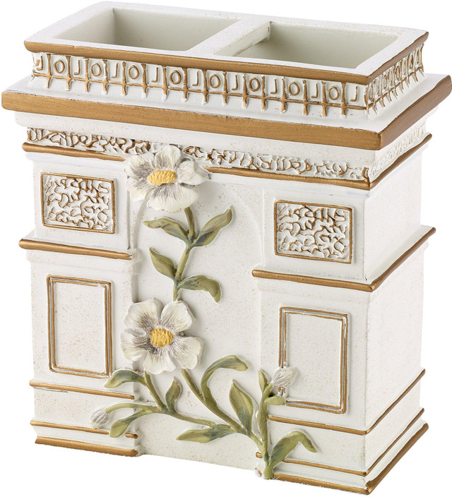 The Avanti Paris Botanique Toothbrush Holder is a figural version of the Arc de Triomphe, decorated with flowers with gold detail. Measures: 4.13 x 2.16 x 4.7 inches.