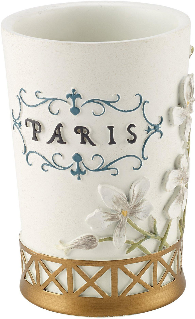 The Avanti Paris Botanique Tumbler features Paris in grey with an Eiffel Tower and flowers in relief in neutral shades on an off-white base. The bottom is bordered with a gold grid. Measures: 3.15 x 3.15 x 4.52 inches.