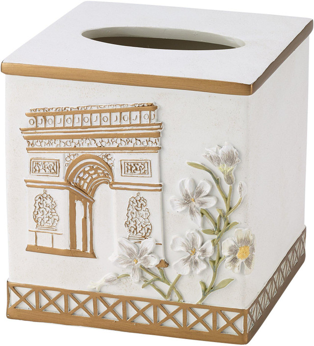 The Avanti Paris Botanique Tissue Cover features the Arc de Triomphe in relief with gold highlights and flowers in neutral shades on an off-white base. The bottom is bordered with a gold grid pulled from the Eiffel Tower. Measures: 5.63 x 5.63 x 6.1 inches.