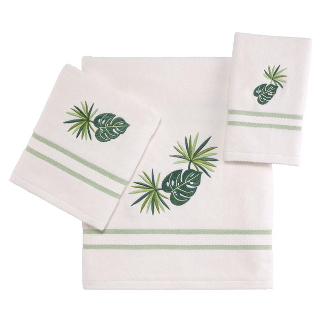The Avanti Viva Palm Decorative Bath Towel features a beautifully embroidered petticoat palm and split leaf philodendron design in various shades of green on a white terry ground. Towel is 100% cotton, exclusive of embellishment, with coordinating green stripes to finish the look. Bath Towel: 27 x 52; Hand Towel: 16 x 28; Fingertip Towel: 11 x 18. Part of the Coastal Bath Collection.