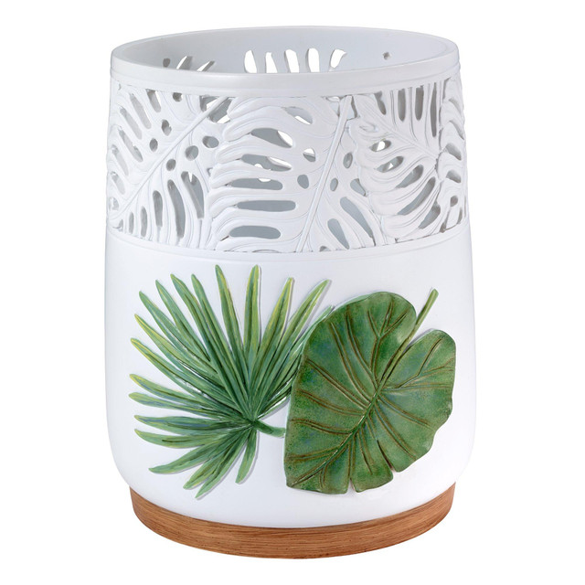 The Avanti Viva Palm Wastebasket / Trashcan features a textural white leaf cut-out background with large three-dimensional philodendron and petticoat palm leaves in multiple shades of green. The base is decorated with a faux-wood finish. Made of durable, hand-painted resin for long-lasting use. Part of the Coastal Bath Collection.
