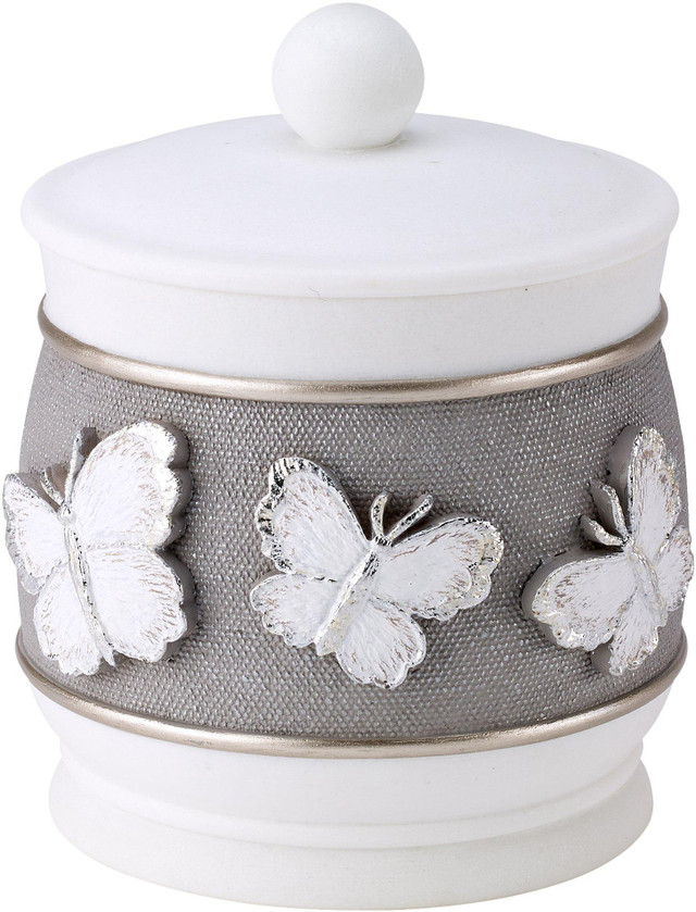 The Avanti Yara Covered Jar features a grey textured center, decorated with 3 raised textural white & silver butterflies, bordered with a silver ring of matte white finish with glitter for a subtle textured top & bottom. Made of durable resin, hand painted. Measures: 4.09 x 4.09 x 4.72 inches.