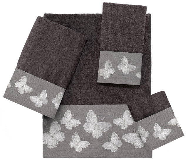 The Avanti Yara Bath Towel features a series of delicately embroidered white butterflies on a grey border attached to a 100% cotton granite velour towel. Towels Measure: Bath 27'' x 50'', Hand 16'' x 30'', Fingertip 11'' x 18'', and Washcloth 13'' x 13''. Each sold separately.