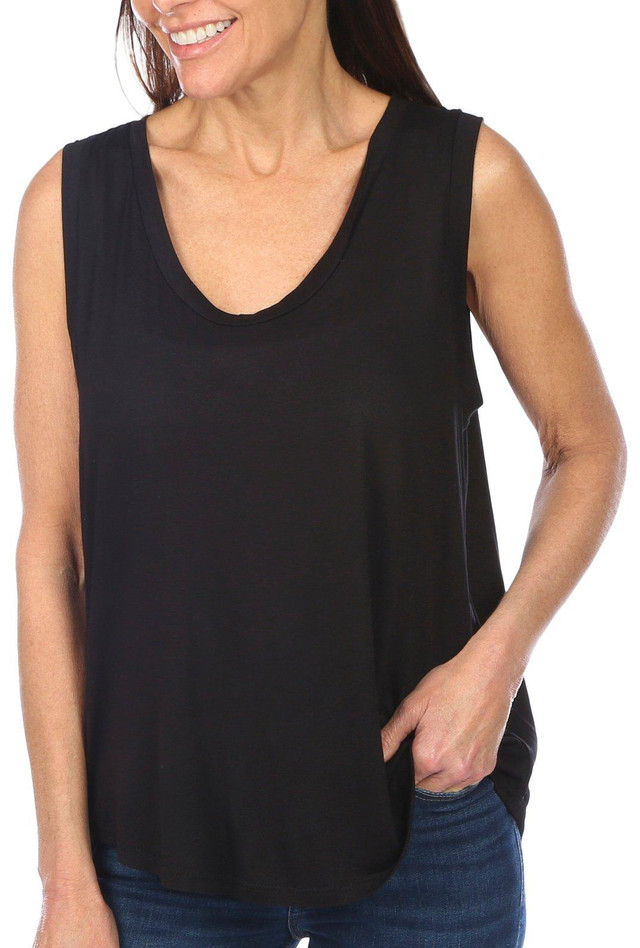 This sleeveless top features a solid color design on soft lightweight knit fabric, a scoop neckline, and a high-low hemline. The top length measures approximately 23 in. from shoulder to hemline, and 25 in. from center back to hemline. Fabrication is 95% rayon and 5% spandex.