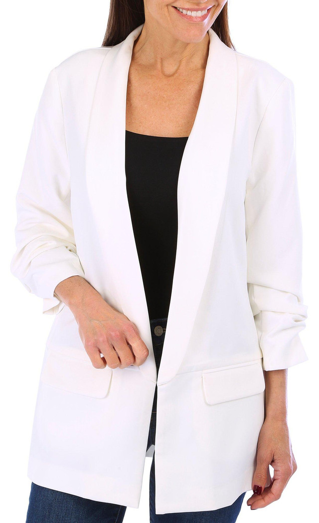 This lined blazer features a solid color design on lightweight crepe fabric, a lapel, two functional flap pockets, ruched sleeves, and relaxed styling. The top length measures approximately 29 in. Fabrication 89% polyester, 11% spandex.