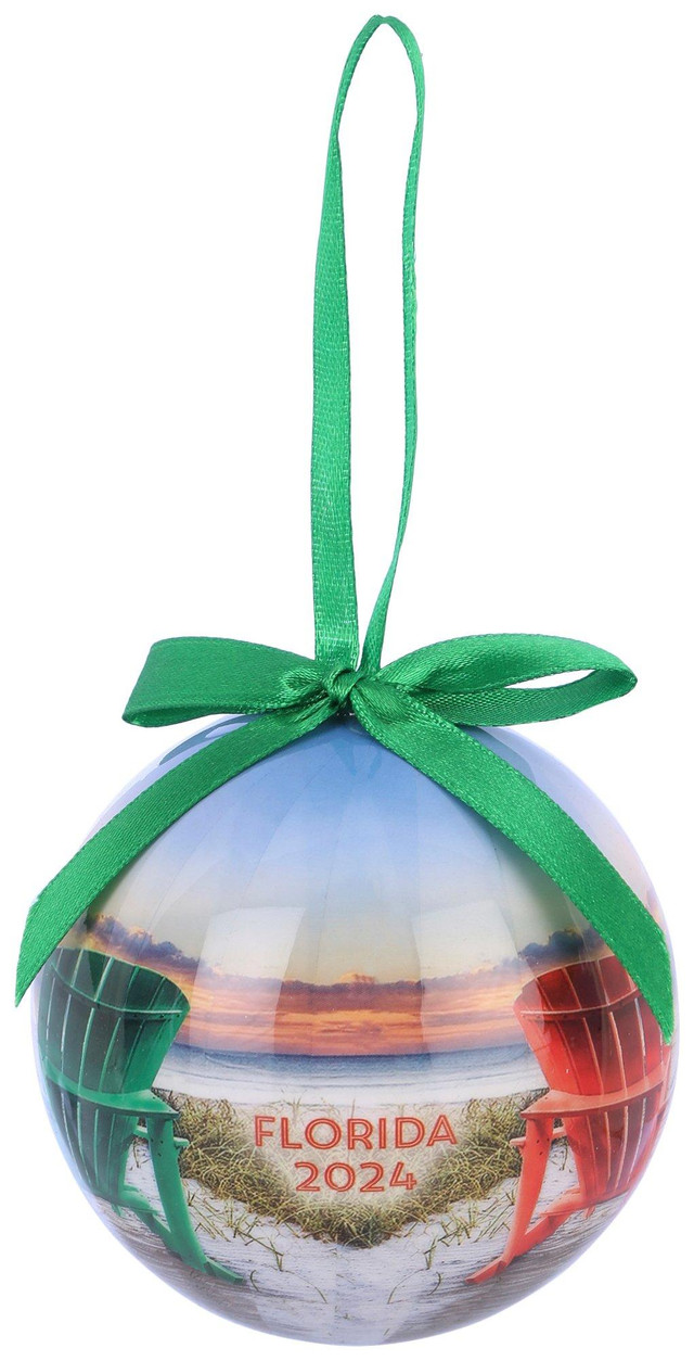 Embrace the spirit of the Sunshine State with the Florida 2024 Adirondack Ornament from Brighten the Season. This delightful ornament features Adirondack chairs alongside a vibrant beach sunset backdrop. Perfect for adding a touch of tropical charm to your holiday decor, this ornament captures the essence of Floridas relaxed and sunny vibe. Measures 3 in x 3 in x 3 in.