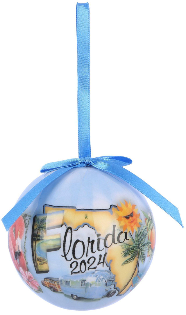 You save 95%Brighten the Season Greeting from Florida ball ornament! This delightful ornament captures the essence of the Sunshine State with vibrant colors and iconic symbols. The state map, a burst of orange, and a whimsical flamingo dance across the glossy surface, evoking warm memories of Floridas beaches and tropical charm. Dimensions are 3 inches in length, 3 inches in width, and 3 inches in height.