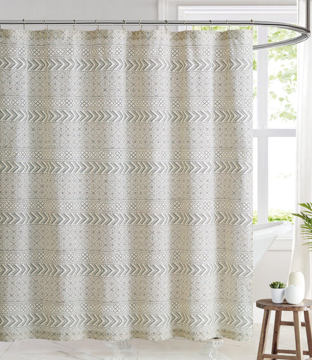 A modern take on a traditional stone tile style print with horizontal bands appearing as stripes from a distance but are more complex as you get closer to the print. Face cloth is 100% cotton woven cloth that is printed. This item has reinforced hook holes. Liner and hardware are not included and must be purchased separately. Includes: one shower curtain 72x72 inches. Shower rod, hooks and liner must be purchased separately. 100% cotton.