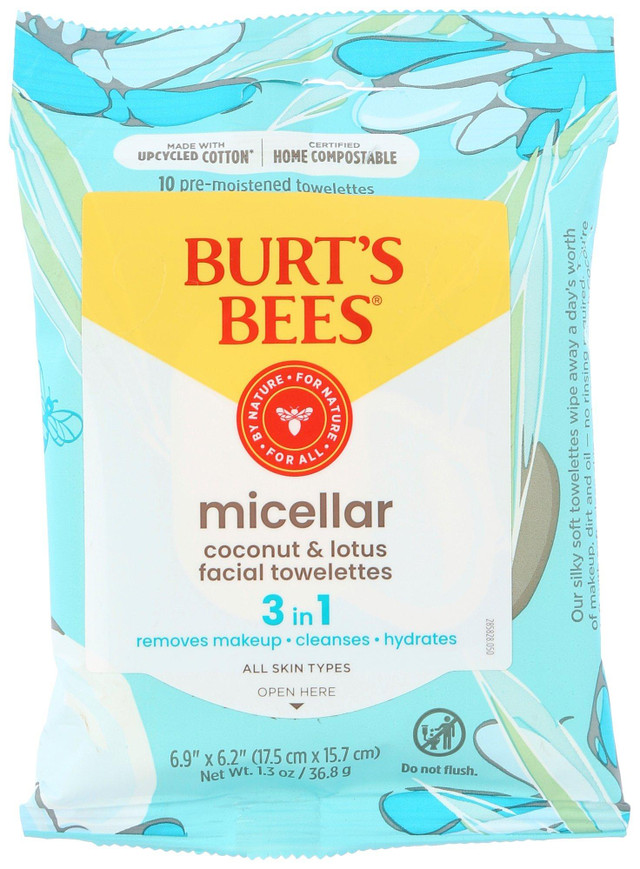 These Coconut & Lotus Water Makeup Removal Towelettes remove makeup, cleanse, and hydrate skin without harsh rubbing or rinsing. Made with upcycled cotton, home compostable, suitable for all skin types. Includes 10 pre-moistened towelettes 6.9 in. x 6.2 in..