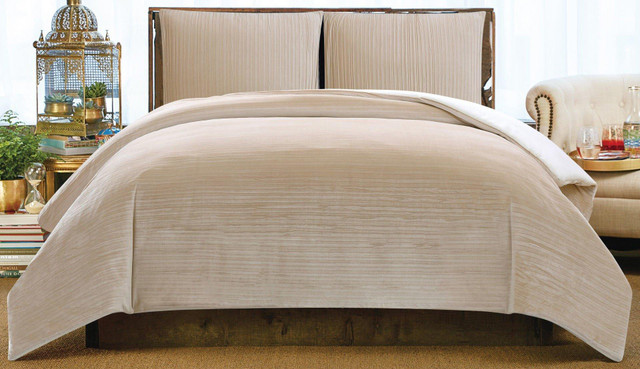 This fashion forward ensemble uses metallic shades in a crinkle style velvet face fabric with the slight crinkle in the velvet that provides a unique surface texture. Comforter set includes a comforter and two pillow shams. 100% polyester face and fill.