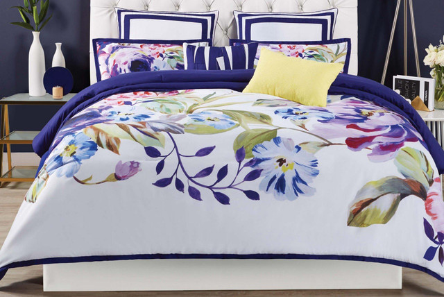 The Garden Bloom Duvet Cover Set by Christian Siriano features a modern over scale painterly floral with vibrant indigo blues, fuchsias on a crisp white ground. Duvet reverses to a solid color. Set includes a duvet and two pillow shams. 100% polyester face and fill.