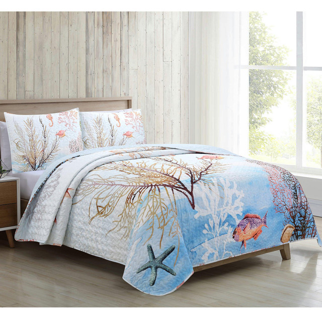 Coastal Home adds a touch of coastal style to your home entertaining, decoration & dining. This quilt set features stylish reef inspired design and includes one quilt and two pillow shams. Fabrication is 100% Polyester. Filling fabrication is 70% Cotton, 19% Polyester, and 11% rayon.