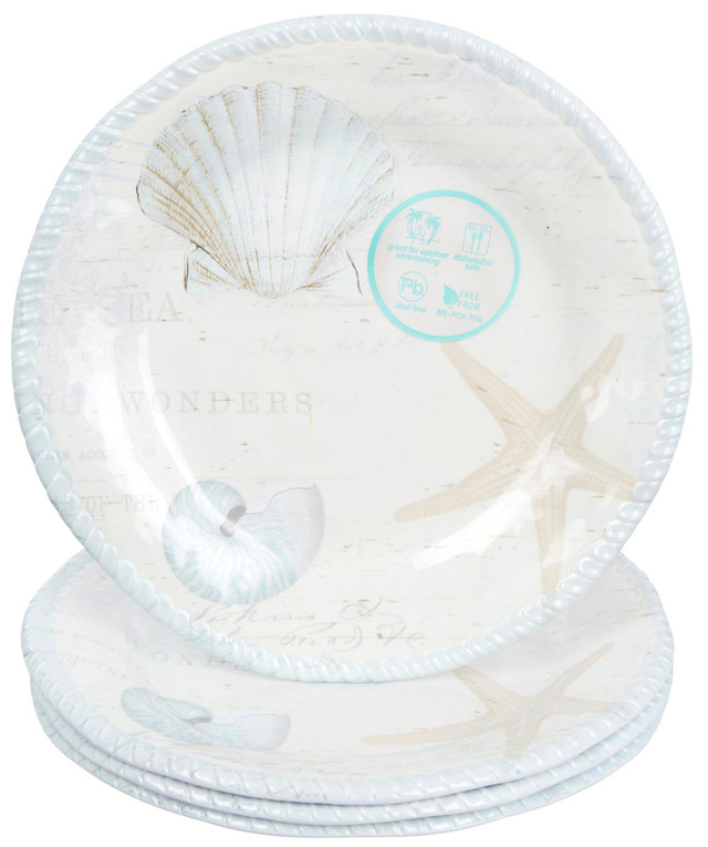Enhance your dining experience with the 4-Pack Shell Print Dinner Plates from Coastal Home. Measuring 11 inches by 11 inches, these plates feature a charming shell design that brings a touch of the seaside to your table. Perfect for both everyday meals and special occasions, these plates combine functionality with coastal elegance. Add a splash of ocean-inspired style to your dining collection with these beautiful and durable dinner plates.