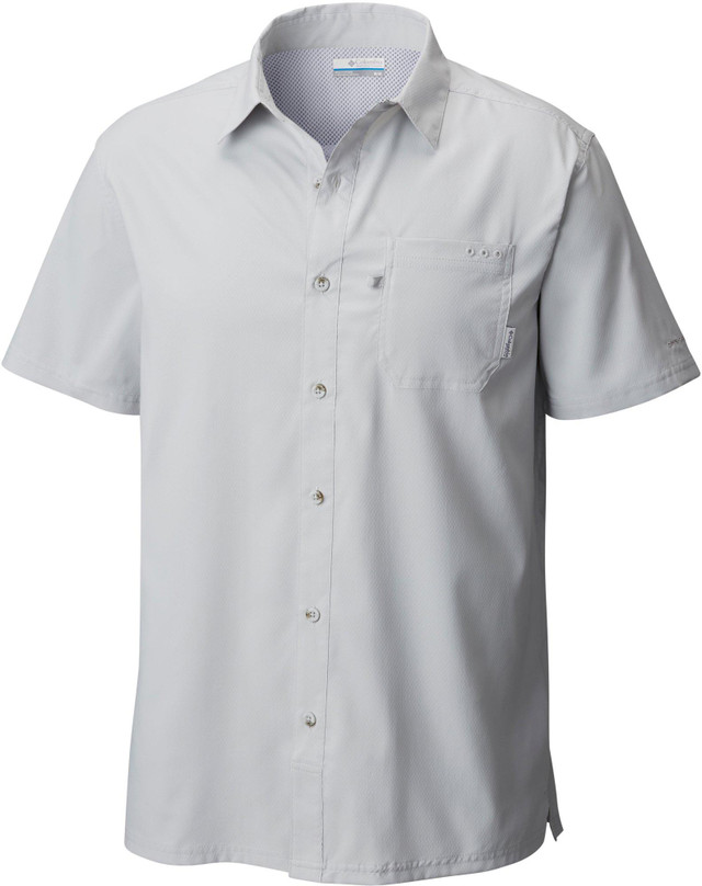Keep each adventure going strong with this PFG Slack Tide Camp shirt by Columbia. You're cool & casual on and off the boat in this comfortable short sleeve shirt, which features lightweight fabric, a breathable back vent, Omni-Shade UPF 50 sun protection, Omni-Wick moisture wicking technology to keep you dry, a versatile solid design for easy matching, button down front, a handy chest pocket, sunglass cleaning patch at the hem of the hemline, a handy utility loop, and classic point collar.