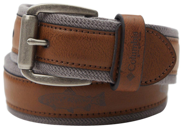 Keep each adventure going strong with this belt by Columbia. This belt features a cotton blend fabric for a comfortable wear, a leather inlay with coastal fish detail, and a stretch fit of up to 2 inches.