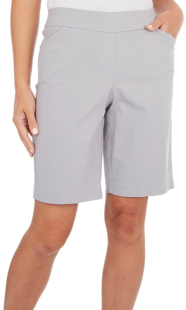 These pull-on shorts feature a solid color design on lightweight stretch knit fabric, an elastic waistband, and two front pockets. Inseam is approximately 10in. Outseam measures approximately 20in. Fabrication 75% rayon, 22% nylon, 3% spandex.