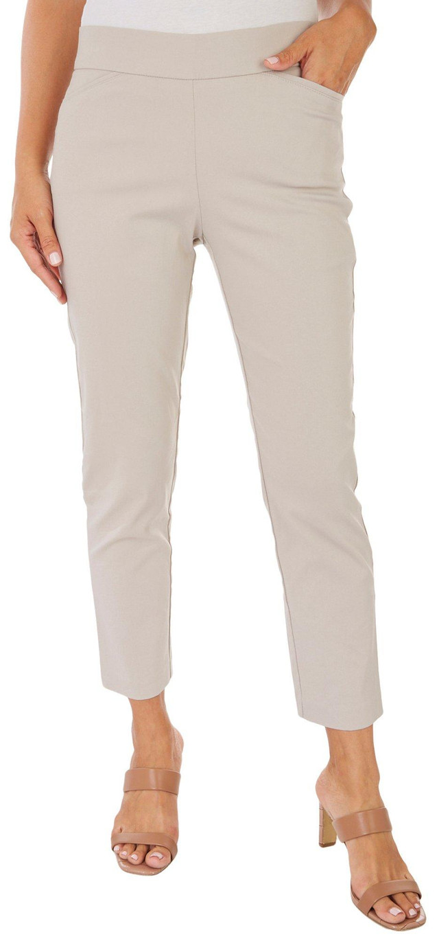 These pull-on pants feature a solid design on lightweight comfort stretch fabric, a hidden elastic waistband for optimal comfort, a slimming tummy panel, two front pockets, two back pockets, and slim fit. Inseam measures approximately 28 inches. Fabrication 75% rayon, 22% nylon, 3% spandex.