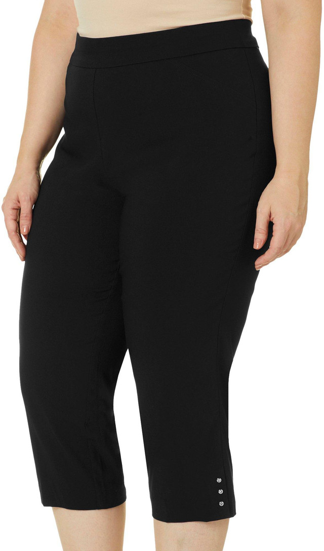 Counterparts offers a stylish look and a comfortable fit. These capris feature a solid color design, a flat front, faux pockets, and side splits with button accents. Inseam is approximately 21 inches.
