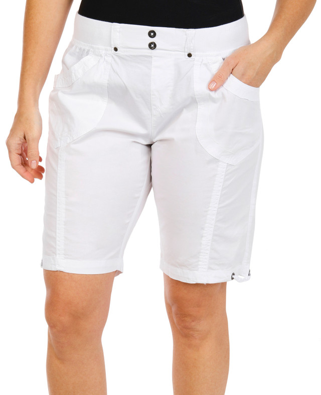 These shorts feature an elastic ribbed waistband with one button closure, two front pockets, two back slip pockets, a drawstring at side hemline, lightweight woven fabric, and a solid color design for effortless matching. Inseam measures approximately 10 in. Outseam measures approximately 20 inches from waistband to hemline. Fabrication is 98% cotton and 2% spandex.