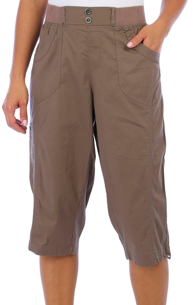 These capris feature an elastic waistband with a two button detail, two front and back pockets, and a solid color design for effortless matching. Inseam measures approximately 21 in. Fabrication is 98% cotton and 2% spandex.