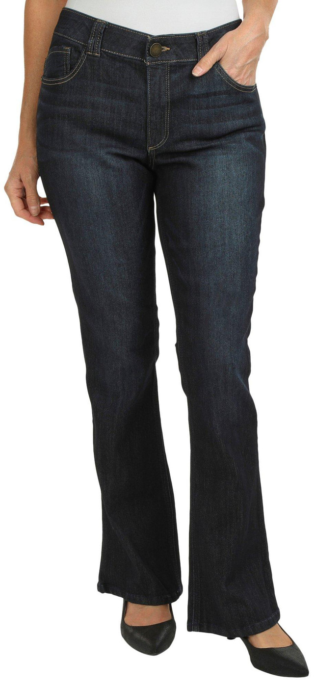 These jeans feature a solid color design on lightweight stretch denim fabric, a stretch waistband, built-in Ab-technology, one-button and zipper closure, five pocket styling, high rise, and a flare leg. The inseam measures approximately 32 in. The outseam measures approximately 42 in. Fabrication 54% cotton, 27% rayon, 17% polyester, 2% spandex.