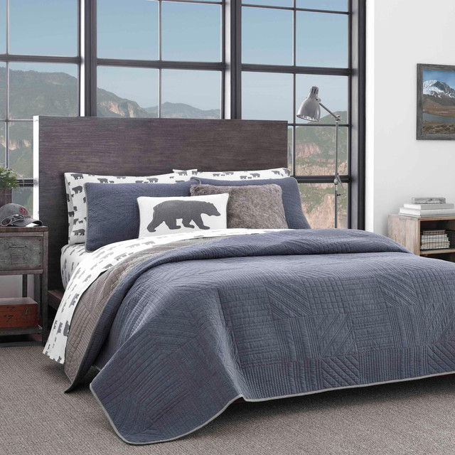 Eddie's favorite - the Hidden Lake collection. Cool and modern, Hidden Lake is an elevated solid featuring a chambray look, reminiscent of denim. The quilt and shams showcase charcoal trim detailing for a tailored look. Reverses to a heathered charcoal. Made from a blend of 80% polyester and 20% cotton, the quilt set is breathable and comfortable. Pre-washed for added softness and relaxed look. Filled with a blend of 80% polyester and 20% cotton, Eddie Bauer quilts are lightweight but warm.