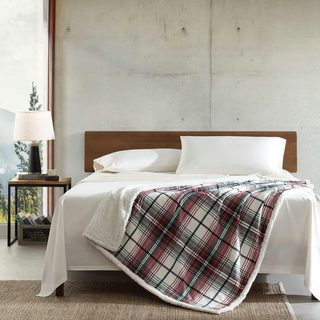 Crafted with yarn-dyed cotton flannel. Reverses to faux shearling popcorn fleece. Super soft and cozy; lightweight, easily packable, and ideal for travel. signature faux shearling trim; features signature Eddie Bauer logo patch. One throw included. Measurements: 60''x 50''