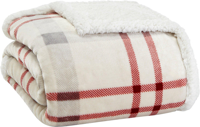 Printed on polyester, this decorative throw blanket features a plaid pattern. Throw reverses to a plush sherpa fleece for comfort. Measures 50'' x 60''.