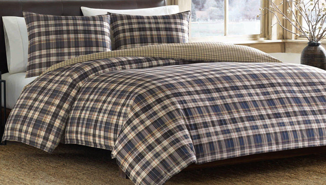 The Port Gamble Duvet Set by Eddie Bauer features a plaid print in navy and khaki. Reverses to a khaki checker print. Set includes a duvet cover and two pillow shams (one twin).