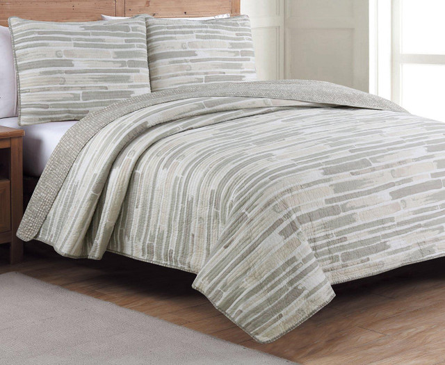 Algarve quilt set is a soft watercolor stripe print in soft tones of taupe and ivory. The printed brushstroke pattern evokes a soothing feeling for your bedroom. The quilt set reverses to a complementary watercolor printed box design. 100% polyester. Set includes one quilt and two pillow shams (one for twin size).