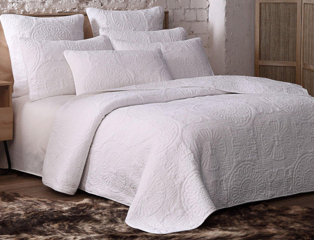 Estate Home brings contemporary style to your bedroom. This quilt set features an intricately stitched floral medallion design. Set includes one quilt and two pillow shams (one for twin size).