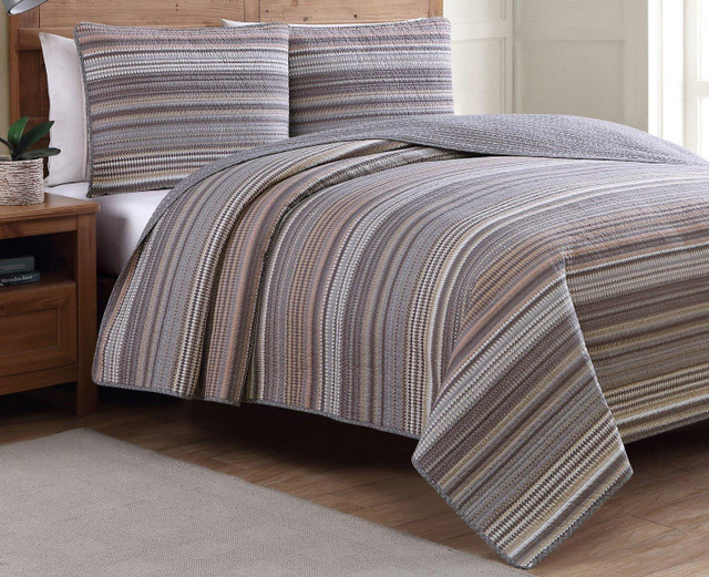 Estate Home brings contemporary style to your bedroom. This quilt set features a zig zag design and a solid reverse. Set includes one quilt and two pillow shams (one for twin size).
