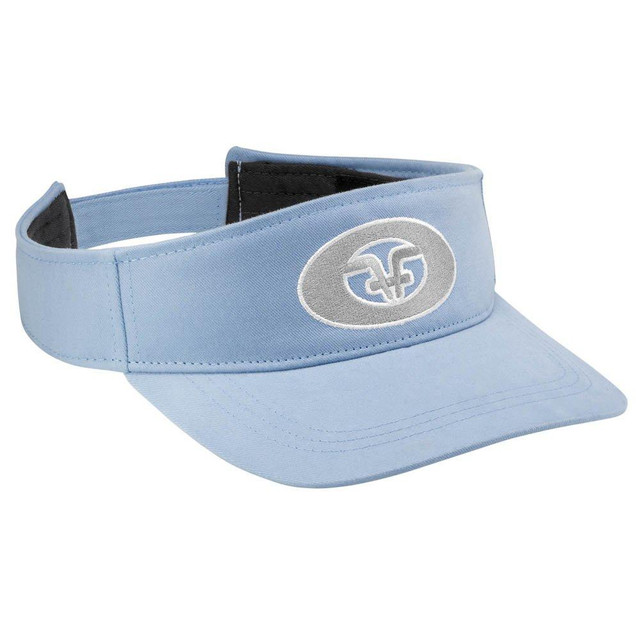 Flying Fisherman Logo Visor in light blue with direct embroidery on front, non-glare undervisor, and adjustable velcro strap closure. Flying Fisherman logo tag on back. One size fits most.