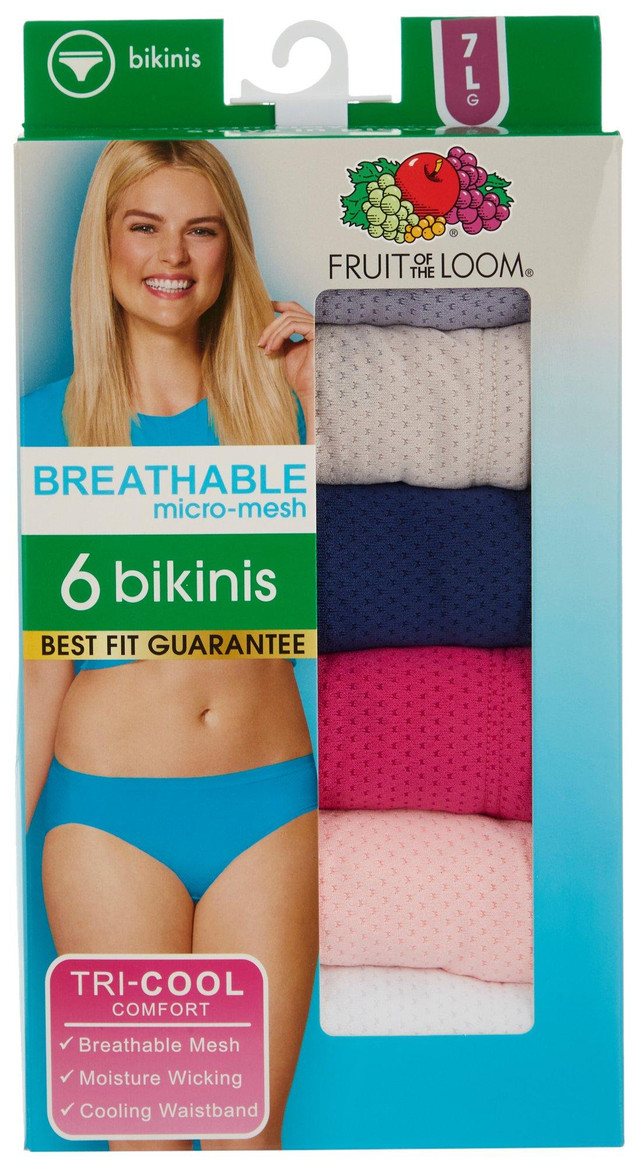 This Fruit of the Loom 6 pk. of Micro-Mesh underwear features assorted solid-color designs on breathable micro-mesh fabric, moisture-wicking technology, a cooling waistband, and 100% cotton liner. Fabrication 93% polyester, 7% spandex.