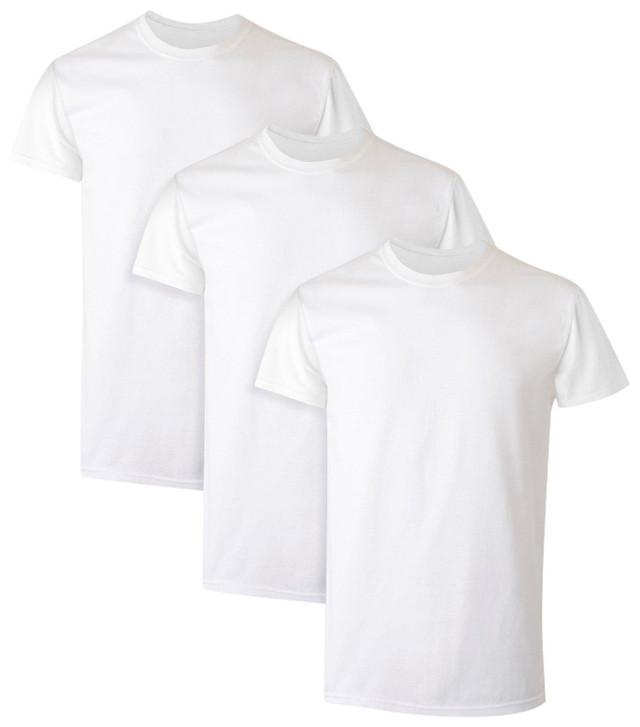 This 3-pack mens t-shirts feature a solid color design on soft and breathable all day flex knit fabric, moisture wicking technology to keep you dry & comfortable, and a finished botton hem that looks good tucked in or out. Includes 3 t-shirts. Fabrication 100% cotton.