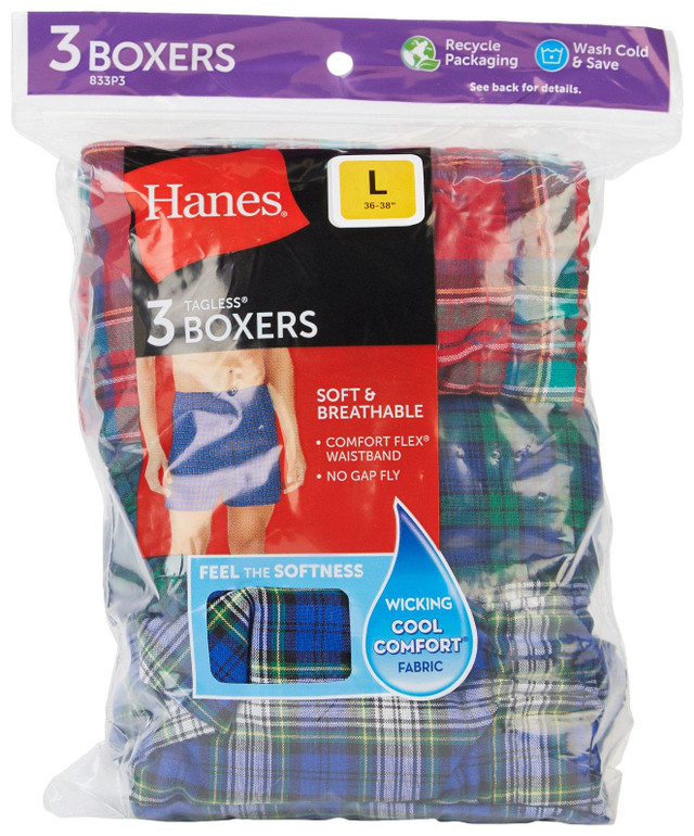 These boxers feature a plaid pattern on a soft knit fabrication, a Comfort Flex elastic waistband that adjusts to fit, a no-gap fly, Cool Comfort wicking technology, and tagless comfort. Contains 3 boxers. Fabrication 55% cotton, 45% polyester.